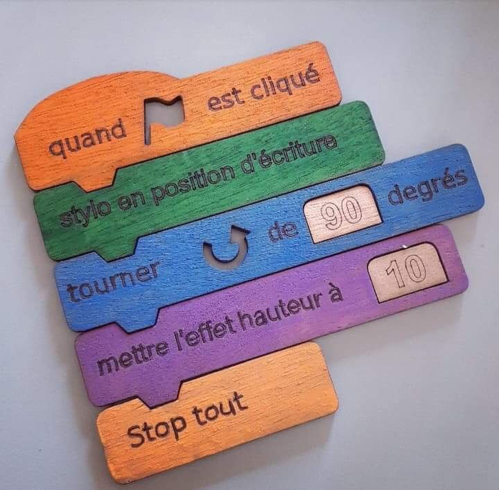 Notre projet consiste en la création d’une mallette pédagogique dont le thème est la programmation. Nous avons créé, avec l’aide de Canopé, des blocs en bois qui reprennent de manière fidèle ceux présents sur le site « Scratch ». En plus de l’écriture en noire, la traduction en braille est présente afin que les enfants déficients visuels lisent les instructions qui sont sur les blocs.